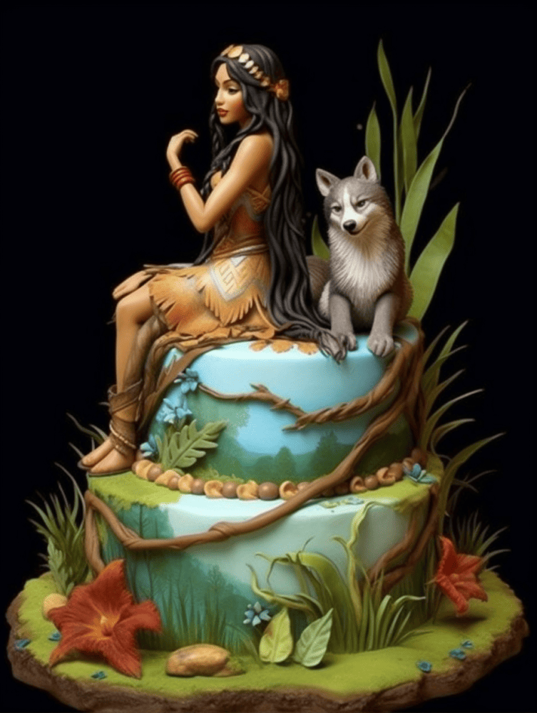 波卡洪塔斯主题双层蛋糕有一个惊人的设计,展示了波卡洪塔斯,一个忠诚的狼同伴坐在蛋糕的顶部。