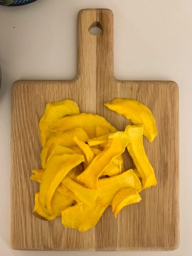 现在你可以享受新鲜的脱水芒果。如果你不吃它一口气(像我们那样),水果储存在密闭容器中。